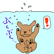 「まずい!!」と思って助けようとしたとき、彼は浮かび上がり、必死で手足をばたばたし出した。彼は犬かきをして泳いでいるのである。私は一寸感動した。しかし多少無茶だったので、もしかすると水が嫌いになったかなぁと心配していたが、それ以来、彼はお風呂場の戸が開くと誰よりも先に入って風呂桶で泳ぐ。