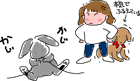 一応伝兵衛はうさぎの後を尻尾を振ってついて行くのだが、うさぎの方がかなり俊敏で、伝兵衛は追いつけない。諦めた伝兵衛は床に寝そべっていたら、うさぎに鼻をかじられ、かじられた鼻をぺろぺろなめていた。